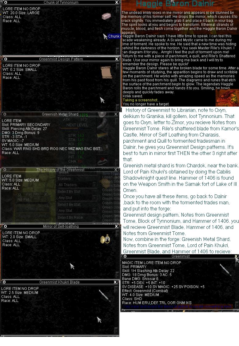 I made these notes from my interpretation of the Sarnak tome. Read them carefully. The weaponsmith who created the Greenmist still exists in some form. He has been tormented for a very long time and may not remember his art. If this is the case, there may still be some chance of recovering the design of the sacred blade. The key lies with the Lich-King's beloved. It is rumored the lich had a mirror created that allows his beloved Drusella to see her former self in its reflection. Perhaps this artifact can offer you some assistance in this quest. Several items will be needed to recreate the Greenmist Khukri. A special hammer was specifically created to fold and sculpt the weapon's blade. Both the Greenmist and this hammer were created on the same day. Only the year is know. The year was 1406. The tome mentions that the Sarnak were actively seeking the tool. The formula that will be needed to melt the Tynnonium is written in the back of this book. Use this book when you find the forge needed to create the Khukri. You will need a design pattern, the block of Tynnonium, the hammer, and this tome to create the Greenmist blade. To finish the weapon, you will need the Lord of Pain's Khukri, this tome, the hammer, the Greenmist blade, and a Greenmist shard or fragment. We have not found any Greenmist fragments. All items must be forged in the hottest of all forges, the Forge of Dalnir. May the will of Cazic -Thule guide you.