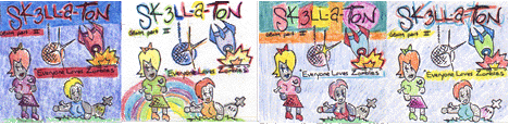 sk3llaton cd contains another hand drawn and colored GBWM comic. While the first cd may be a sonic adventure, this one is more for getting the party started. (sumpin' bumpin') No party is a party unless it's a Sparntz party, and no party is a Spiz-ArntZ party without such hits as: Raise the Dead, Aunt Debbies Camal Toe, Blinkety Blanket, Top Shop Hop, and the fully blunted classic; Voodoo Rasta Zion Lion. This and ten more songs can be found on this skellaton masterpiece: "Everyone Loves Zombies"
