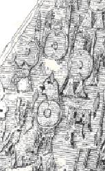 This shield press is made from four 3ft long sections of 2x12 pine, 8 18" lengths of large threaded rod, 16 large washers and nuts. We regularly make three shields at a time in our version of this press. Cross-drill the bolt holes (shown as dashed lines) BEFORE you cut the curves. Make four of the forms shown below; dimensions are in inches. Tairdelbach and Leif made this one for the local Barony. It's produced a lot of shields.