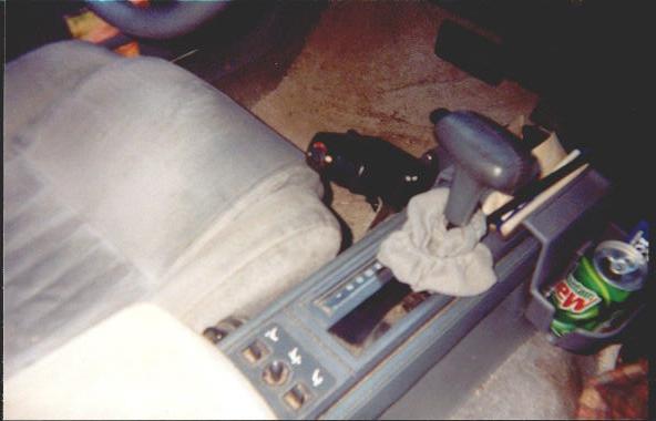 Here is a view of the brake controller in the tow car. Not a very good picture but all my closeups turned out blurry. The controller is a Tekonsha Envoy, which applies power to the Hydrastar in a way that is proportional to how hard the car is trying to stop. I used the standard mounting bracket, along with a piece of stainless steel and a piece of aluminum channel to mount the controller to my console without drilling. The wires are run into the console, under the carpet, and to the dash. Wow what a job, considering that I did it in a snowstorm. Around here, you cant let the weather get you down or you wont get anything done.