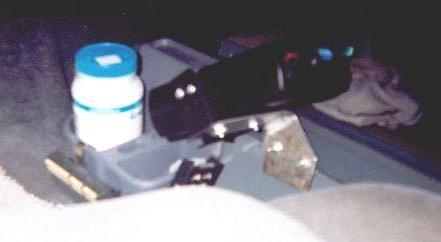 Heres another view of the stainless bracket I made to attach the controller to the console. The visible bracket is not screwed to the console, but is screwed to the piece of channel. The channel fits perfectly to the shape of the console construction, and is sandwiched between the upper and lower console halves. The lower extension of the visible bracket keeps the controller from wanting to move downward. I like the controller in this location. I can reach it very easily and without looking. It doesnt block my heater duct, cupholders, or get in my way. Its just perfect.