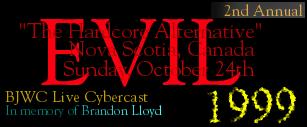 (EVIL 99-Hardcore Alternative- Second Annual PPV. Clicks show flashbacks from BJWC's first EVER BJWC EVIL PPV. Clips of Jeph Phillips sitting behind the announcers table, and clips from now with James Edgebrook behind the table. Clips of crowning Officer and a Gentleman tag champs. Clips of the first ever PUMPKIN BASH MATCH with the cage weapons match and the addition of the pumpkins. Clips of all three women in action the ones who will fighting in this years Annual Pumpkin Bash match! Clips of Jennifer Streaks holding up the Women's Championshoip in front of the EVIL apron! Clips of the Lightweight Battle with Phalkon suprising all as the first LW Champ. A series of clips of the AWESOME and still remembered HARDCORE Six Way battle! Highlights include Exodus getting hit by a CAR and Ness Manson pinning Exodus on the Zamboni snow stained with the red blood, clips of Tyler Lee on the second balcony tosses chair down into the ring like a mad man. And the big finish with Ness and Tyler Lee with the Nasty Texan ending Lee with a Garvin Stomp. And clips of Tyler Lee now with the ICON DDT, and Dante's THE HIT, Goliath's OVERDOSE and him holding the title above his head matching Ness Manson holding the belt high over his head. And the Main Event with Jiggallo and Cruicble battling it out to a no contest finish and clips of TA and Cyris! Clips of the old Hallo We EVIL logo and the new BJWC EVIL 99 logo flash back and fourth and faster paced EVIL music hits as clips of all the BJWC Stars play fast paced clips of Kahn, Dante, Hart, Rebecca, Dehart, Danica, Cyris, Exodus, Billy Jay, TA, Napoleon, G-Crusher, Tyler Lee, Goliath, Chris McClane along with many others as the fast clips fly by. And the songs comes to a close and the BJWC Evil 99 logo fades away.)