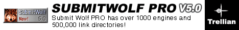 SubmitWolf PRO is an easy to use, professional website promotional tool, which automates the process of promoting your web pages on the Internet. It can dramatically increase the number of visitors to your web site. SubmitWolf PRO can automatically register your websites with thousands of engines and directories PLUS over 500000 link pages. How does it work? Simply enter your website details into SubmitWolf PRO, select the search engines where you would like to be listed and SubmitWolf PRO will do the rest. SubmitWolf PRO automatically visits each engine, downloads the registration form, fill's it in for you and submits it. It does this in exactly the same way as if you did it manually using a browser. To add your link to just a thousand engines by hand would take months of your time, with SubmitWolf PRO, the same task takes minutes! Benefits
