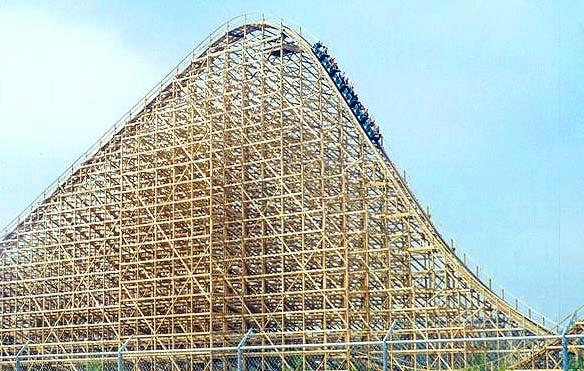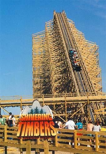 We rode six times, six wonderful, incredible rides. I liked the second seat best, though no seat stood out all *that* much - they were all great rides, even from the middle. We discussed every aspect of it but the one question we kept coming back to, and our mantra for the day was, "Why here?" Why couldn't it be *anywhere* but here? This park has no lights so it has to close before dark. And what is up with that, is this a law or some policy dictated to the park? And if so, by whom? There's not a soul around to be bothered, so I have to guess its only purpose is to piss all of us off by having a magnificent coaster like Shivering Timbers and then denying us the opportunity to ride it at night. But for today, all is well. My work here is done. They closed the line for Shivering Timbers, so Shawn and I wanted to take one ride on the Wolverine Wildcat. Cindy mentioned that this was inspired by the Pheonix at Knoebels. Oh good, this should be great then! But I remembered reading some of the comments from respectable RRCers who had less than charitable things to say about it's condition. So I approached with caution. If Shivering Timbers was the best roller-coaster I have ever ridden, then Wolverine Wildcat was surely the worst. How ironic that this park would contain both. Perhaps we chose a wheel seat, I don't know and I don't care. All I know is that by the bottom of the first drop I knew I was in trouble. The pain was shocking and it tore through my side like a bear with it's claws. I lost my breath less than halfway through the ride and could only grunt as we returned to the station. Shawn timidly said "Wow, if the Pheonix is anything like that, I don't think I'll like it." He found it extremely painful, too, though he wasn't nursing a bruised rib cage. My rides on ST hurt but up until then I had managed to live with it. Now I hurt BAD. Cindy wanted to ride the Corkscrew to complete her coaster count within the park, so we walked on over. The station housing the coaster is.... well,.... it's..... it's ugly. That's about all I can say. It's so ugly I can't even say how ugly it is. It's so ugly I feel sorry for it. I feel sorry for a building, that's how ugly it is. We tried to make a run for Zach's Zoomer before the park closed. We were too late. It was seven o'clock on a Saturday night in June and the park was closed. As Bette Davis once said "WHAT.... A.... DUMP." Still, I'm grateful to Michigan's Adventure. Any park that has sno cones and Shivering Timbers is okay in my book. Shivering Timbers was well worth the trip. Every element on this coaster is worthy of discussion. Boy did CCI deliver the goods. They gave the park and the coaster loving community something that is unquestionably unique and memorable. In a year when the amusement park industry began to recognize and talk about the wooden roller-coaster, Shivering Timbers will be remembered as the most talked about one of them all.