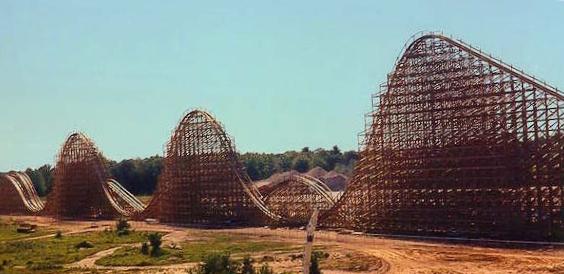 To say that the trees parted and the skies cleared would not be an exaggeration. This is the most visually stunning coaster I have ever laid my eyes on. An absolutely MASSIVE display of rolling hills, it looks like the biggest coaster ever built. I am so tempted to pull off to the side of the road and just gawk - it's obvious from the well-worn shoulder that "coaster gawking" has become something of a pastime here, and with good reason. Shivering Timbers has been hyped in many ways, but the wonder of looking at it cannot be overstated. It defines magnificence. It is 3:30 by the time we arrive. And dare I say the three of us have become quite.... perky. The park closes at 7:00 so there is no time to waste. We paid our admission and headed straight for the coaster. Intent as I was on riding, I could not help but utter an observant "Oh, my" once it dawned on me that at this moment I was clearly in the middle of the most pitiful park on the planet. To call this park homely would be charitable. A slash and burn policy was implemented to level the land and build the park, and it's ironic seeing miles of evergreen trees just beyond the park's borders. No trees, no landscape, no shading, no buildings of any interest, no nuthin. Let's face it, they paved paradise and put up a parking lot. With rides.