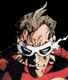 -- Description: a spry, barechested masked man clad in gold, with a blue trenchcoat,