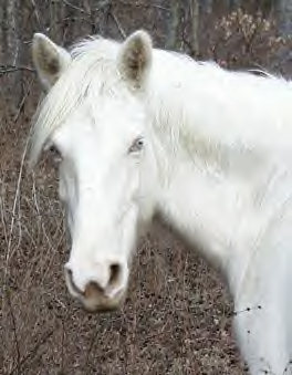 Blizzard looks like a horse straight from a medieval tapestry. With his crystal blue eyes and brilliant white coat, he looks like a knight's mount, if one doesn't factor in his diminuitive size. "Bliz" is a sweetheart of a pony, who always comes up to greet you in the pasture. He loves getting baths, which is a good thing because his perfect white coat never stays clean for long. Blizzard is friendly and affectionate with everybody, especially children, but he doesn't hesitate to let his spirit show on a sunny day when he's feeling his oats. Such a beautiful horse cannot be described in words -- come on down and meet him yourself.