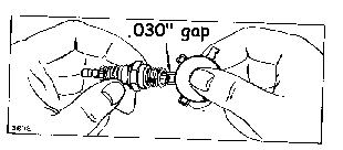 Clean spark plug with a pen knife or wire brush and solvent and set gap at .030" for all models. If electrodes are burned away, or the porcelain is cracked, replace with a new plug.