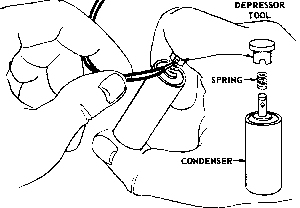 Insert breaker plunger into the plunger hole in cylinder. Breaker points as shown in Photo are installed by placing the mounting post of the breaker arm into the recess in the cylinder so that the grove in the post fits the notch in the recess. Tighten the mounting screw securely. Use the ¼" spinner wrench if available. Slip the open loop of breaker arm spring through the two holes in the arm, then hook closed loop of spring over the small post protruding from the cylinder. Push flat end of the breaker arm into the groove in the mounting post. This places tension on the spring and pulls arm against the plunger. If condenser post is threaded, attach the coil primary wire (and ground wire if furnished) with the lock washer and nut. If primary wire is fastened to condenser with spring fastener, compress spring and slip primary wire and ground wire where furnished into the condenser post. Release spring. Lay the condenser in place and tighten the condenser clamp securely. Install spring to breaker arm as shown in photo.