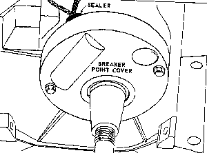 The breaker point cover. Photo protects the points from dirt. The opening for the primary and or ground wire should be sealed with NO. 2 Permatex or similar sealer to prevent dirt from entering the breaker box. Cover should not be distorted so as to lose its seal around the outer edge. Replace if damaged.