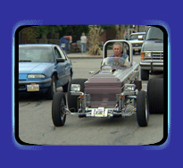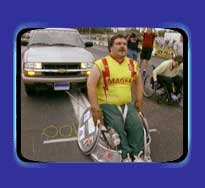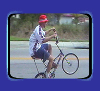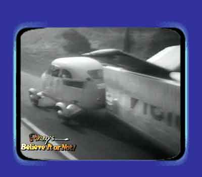 Bobby Root pedals his bike up to 86mph, then pulls up the front end and rides a wheelie for more than 300 feet! The unconnected vehicle ahead is only acting as a windbreak in this photo.