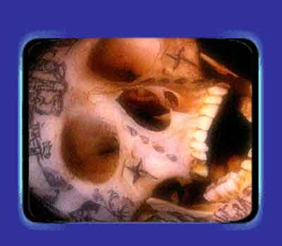 This is the world's only Human Scrimshaw Skeleton, made in a secret location. If you look closely you will see that there are over 300 drawings and designs carved right into the human bones.