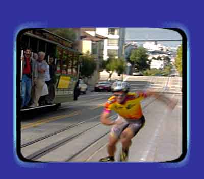 Eddy Matzger rarely takes off his in-line skates. In fact, he once climbed to the top of Mt. Kilimanjaro 19,344 feet high, wearing them. Now he uses them to race a cable car up San Francisco's Hyde Street, one of the steepest in any American city.