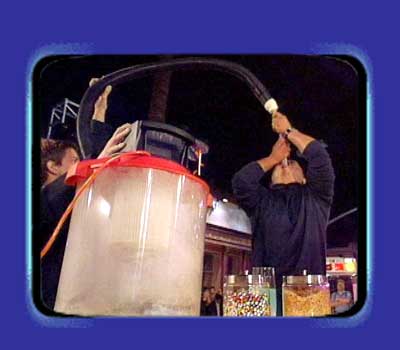 Danielle Stampe lets 2,000,000 volts of electricity pass through her body, enabling her to light dozens of florescent tubes held by the audience. Just minutes ago, a test dummy burst into flame when the power was turned on!