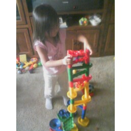 Above, she pretended to build a gate of a castle using the chairs in the lobby room. Then she would push a chair around pretening we were in a grocery store shopping for food.
