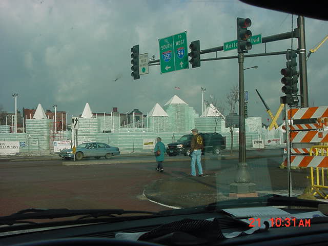 Southwest corner on Kellog Boulevard and ? from the car by the Xcel Energy Center