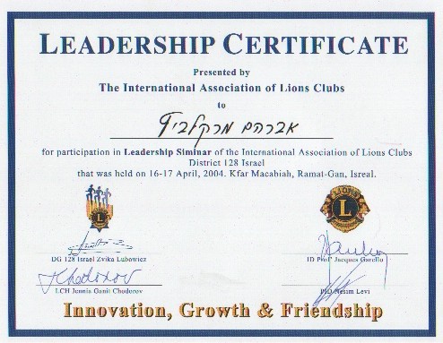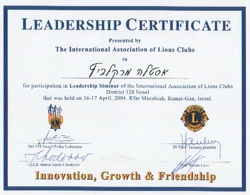 el Distrito 128-Israel, realizada el 18.7.05 en Kfar Hayarok, nuestro Club, el Club de Leones "Dan Paz-Israel" (Hispanoparlante) recibio el Premio al Mejor Club