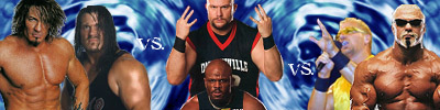 Bubba Ray Dudley: Seeing as this is Wrestlemania...we've decided to stir things up a bit! We just talked with Linda McMahon, and she's added a stipulation to this match! This Tag Team Title match...is a TABLES MATCH! The rules here are simple...once one member of a team is sent through a table...that team is eliminated! The last team standing...are the WINNERS...and WWE Tag Team Champions! Before the Dudleyz climb into the ring, they set tables up all around the outside of the ring. They certainly came prepared for this match! The Dudleyz slide into the ring as the bell sounds and the match gets underway! As the Dudleyz slide into the ring...the Wolfpac immediately attacks! Before Bubba and D-Von can even get to their feet...Jarrett and Steiner STOMP away at the challengers! Road Dogg and Billy Gunn sneak up behind Jarrett and Steiner...and hit...DUAL GERMAN SUPLEXES! The Road Dogg and Gunn quickly get to their feet and deliver CROTCH CHOPS as the fans go absolutely crazy! Road Dogg pulls Jarrett to his feet...and drops him with a DDT! Billy Gunn pulls Steiner up for a DDT of his own...REVERSAL! Steiner reverses it into a NORTHERN LIGHT SUPLEX! As Steiner holds the move there...Road Dogg KICKS Steiner right in the stomach! Road Dogg pulls Steiner to his feet...but Scotty takes him down with a STEINER-LINE! Steiner lines up Road Dogg...and drops an ELBOW! Steiner turns over and starts to do push-ups as the fans start to boo. As Steiner gets to his feet...Bubba grabs Steiner from behind....BUBBA BOMB! D-Von runs to the ropes...and hits a LEG DROP ON STEINER! Jarrett gets back to his feet...and runs at D-Von...BACK BODY DROP! Over the top to the outside! Jarrett hits his head on the table...but the table doesn't break! The Wolfpac was lucky there...I don't know so much about Jarrett's condition...but the Wolfpac is not out! As D-Von yells down at Jarrett...Billy Gunn comes up from behind and hits a FOREARM to the back! Bubba then turns to Gunn and hits him with a series of bunches...and then an ELBOW to the forehead! Gunn is dropped to the mat! D-Von and Bubba pull Road Dogg to his feet...and start to punch away at James. The Dudleyz IRISH WHIP James to the ropes...DOUBLE ELBOW! Steiner starts to get back to his feet...but Bubba drops him with a CLOTHESLINE! Jarrett is finally starting to move after taking that big bump. What's this? Bubba is telling D-Von it's time for him to go to the top! D-Von climbs up to the top rope as Bubba SLAMS Road Dogg to the mat! Bubba looks up at D-Von......WHASSSSSSUUPPP!! WAIT! NO! Jarrett is back up on the apron...and pushes D-Von! D-Von falls off of the top rope...and THROUGH A TABLE!! D-Von has went through a table! The Dudley Boyz have been eliminated! Bubba Ray can't believe it! Jarrett looks over at Bubba and waves goodbye with a grin on his face. Bubba stares back at Jarrett...and ATTACKS! Bubba grabs hold of Jarrett....BUBBA BOMB! A little revenge by Bubba on Jeff Jarrett! As Jarrett lay motionless in the ring...Billy Gunn decides to capitalize. Gunn pulls Jarrett to his feet....FAMEASSER!! Jarrett is out! Gunn goes to the outside and grabs a table. Badd Ass pushes it into the ring and climbs back in. As Badd Ass sets it up...Steiner attacks Gunn from behind...and hits...a REVERSE DDT! Steiner lifts Gunn up and sets him on the table. Steiner is climbing up to the top rope! What is he doing? This isn't normal for Scott Steiner! Steiner leaps off the top rope...BIG SPLASH! NO! Gunn moves out of the way...and Steiner goes through the table! Steiner is out...but the Wolfpac isn't! The rules state that you must be forced through a table by your opponent! The Wolfpac is still in it! Road Dogg and Jeff Jarrett start to get back to their feet. James comes in with a right hand...runs to the ropes...FLYING FOREARM! James slides to the outside and gets some more wood! Road Dogg sets it up in the middle of the ring. James pulls Jarrett to his feet...he's setting up for a GUT-WRENCH POWERBOMB! NO! Jarrett blocks it! Jarrett grabs hold of Road Dogg...he's setting up for...THE STROKE! Jarrett hit it...THROUGH A TABLE! Road Dogg has been sent through a table! The nWo Wolfpac are still the Tag Team Champions!! HERE ARE YOUR WINNERS / nWo WOLFPAC (JARRETT & STEINER)