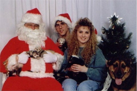 Jen and Jason (friend) with Tia, Bo, Odie (ferrets), Thumper (skunk), and Maddie (Dog).