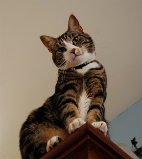 One freezing cold winters day, about two to three years ago we saw a flash run past our bushes. It looked exactly like our older now passed on cat Biskit yet younger and thinner. We would see him from time to time and so we put out a bowl of water and cat food. Sure enough in the middle of the night the strange one came. He had bright yellow piercing eyes that stared at you. Sometimes he would put down a false lid, that was kind of see through, kind of like when crocodiles sleep yet keep watch. He was so frightend and hollow inside. He only weighed 2 lbs if at all. We figure he is about a year old if that. Needless to say, we coaxed him in and claimed him ours. Maximus is now older, fatter, healthier and happier. His frostbitten paw pads are all healed and he no longer keeps a watchful eye. I named him Maximus after the movie Gladiator played by Russell Crowe, because he was a gladiator out there in the wilderness against the wind, weather and creatures of the night. We love you Max!