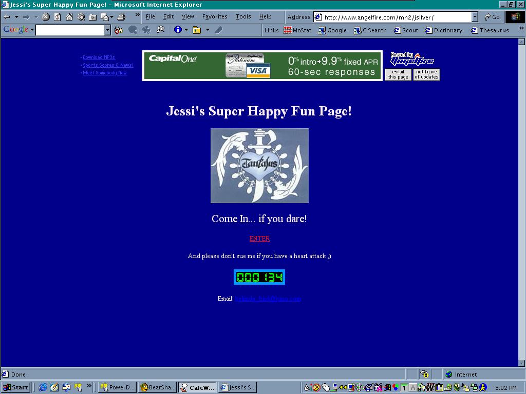 In any case, it took me two tries to get this baby up and running, and in case you're wondering, my first attempt went up in smoke once my index page fried itself. I swear it wasn't my fault! So now I'm trying to lay off the colorful backgrounds and ubuquitous (useless) silly pictures, and maybe it will all work out.