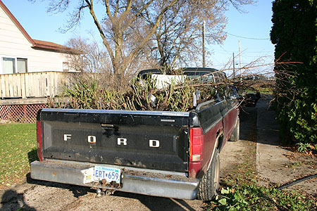 After all our rosebushes had been dug up, we put most of them in our truck, some went in my car for tranporting to our farm. It took us about 5 hours between the two of us to dig up aroudn 106 rosebushes. Some of the longer ones in the truck are trees that we dug up, not rosebushes.