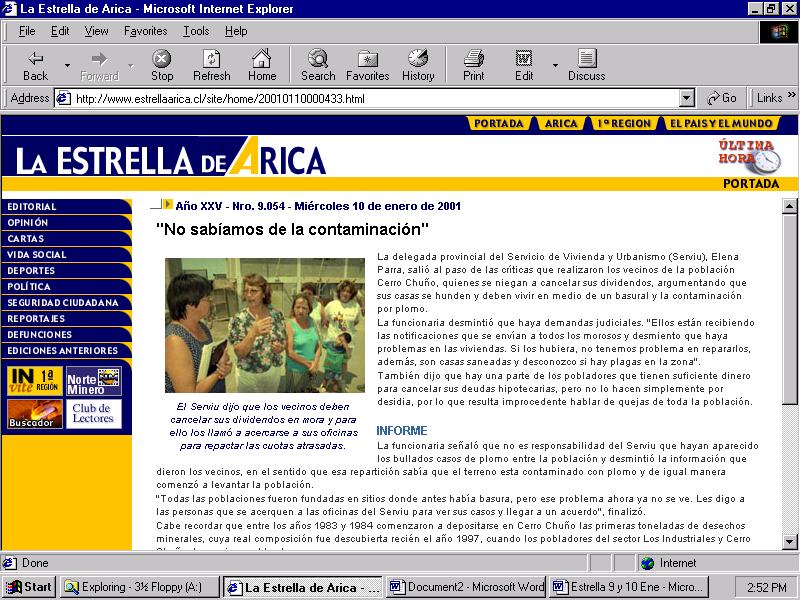 La funcionaria desmintió que haya demandas judiciales. "Ellos están recibiendo las notificaciones que se envían a todos los morosos y desmiento que haya problemas en las viviendas. Si los hubiera, no tenemos problema en repararlos, además, son casas saneadas y desconozco si hay plagas en la zona". También dijo que hay una parte de los pobladores que tienen suficiente dinero para cancelar sus deudas hipotecarias, pero no lo hacen simplemente por desidia, por lo que resulta improcedente hablar de quejas de toda la población. INFORME La funcionaria señaló que no es responsabilidad del Serviu que hayan aparecido los bullados casos de plomo entre la población y desmintió la información que dieron los vecinos, en el sentido que esa repartición sabía que el terreno esta contaminado con plomo y de igual manera comenzó a levantar la población. "Todas las poblaciones fueron fundadas en sitios donde antes había basura, pero ese problema ahora ya no se ve. Les digo a las personas que se acerquen a las oficinas del Serviu para ver sus casos y llegar a un acuerdo", finalizó. Cabe recordar que entre los años 1983 y 1984 comenzaron a depositarse en Cerro Chuño las primeras toneladas de desechos minerales, cuya real composición fue descubierta recién el año 1997, cuando los pobladores del sector Los Industriales y Cerro Chuño denunciaron el hecho. Esta población comenzó a edificarse a mediados de 1991 y, según Elena Parra, el Serviu y el Servicio de Salud no sabían que en esos terrenos existían minerales. "Antes no existían las exigencias ambientales que ahora son reguladas por ley; en ese tiempo no había estudios de impacto ambiental y el Serviu desconocía la existencia de plomo", afirmó. |