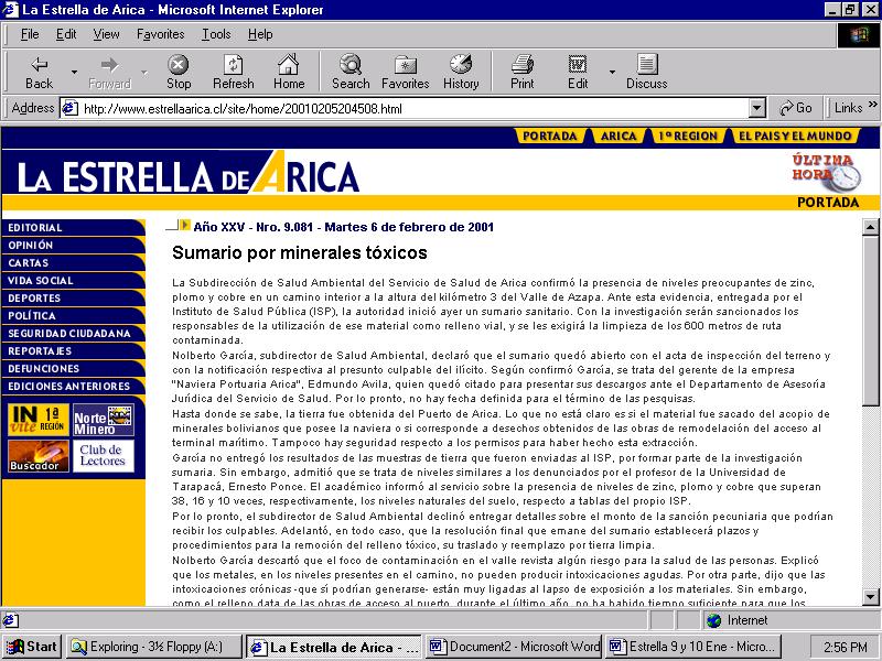 La Subdirección de Salud Ambiental del Servicio de Salud de Arica confirmó la presencia de niveles preocupantes de zinc, plomo y cobre en un camino interior a la altura del kilómetro 3 del Valle de Azapa. Ante esta evidencia, entregada por el Instituto de Salud Pública (ISP), la autoridad inició ayer un sumario sanitario. Con la investigación serán sancionados los responsables de la utilización de ese material como relleno vial, y se les exigirá la limpieza de los 600 metros de ruta contaminada. Nolberto García, subdirector de Salud Ambiental, declaró que el sumario quedó abierto con el acta de inspección del terreno y con la notificación respectiva al presunto culpable del ilícito. Según confirmó García, se trata del gerente de la empresa "Naviera Portuaria Arica", Edmundo Avila, quien quedó citado para presentar sus descargos ante el Departamento de Asesoría Jurídica del Servicio de Salud. Por lo pronto, no hay fecha definida para el término de las pesquisas. Hasta donde se sabe, la tierra fue obtenida del Puerto de Arica. Lo que no está claro es si el material fue sacado del acopio de minerales bolivianos que posee la naviera o si corresponde a desechos obtenidos de las obras de remodelación del acceso al terminal marítimo. Tampoco hay seguridad respecto a los permisos para haber hecho esta extracción. García no entregó los resultados de las muestras de tierra que fueron enviadas al ISP, por formar parte de la investigación sumaria. Sin embargo, admitió que se trata de niveles similares a los denunciados por el profesor de la Universidad de Tarapacá, Ernesto Ponce. El académico informó al servicio sobre la presencia de niveles de zinc, plomo y cobre que superan 38, 16 y 10 veces, respectivamente, los niveles naturales del suelo, respecto a tablas del propio ISP. Por lo pronto, el subdirector de Salud Ambiental declinó entregar detalles sobre el monto de la sanción pecuniaria que podrían recibir los culpables. Adelantó, en todo caso, que la resolución final que emane del sumario establecerá plazos y procedimientos para la remoción del relleno tóxico, su traslado y reemplazo por tierra limpia. Nolberto García descartó que el foco de contaminación en el valle revista algún riesgo para la salud de las personas. Explicó que los metales, en los niveles presentes en el camino, no pueden producir intoxicaciones agudas. Por otra parte, dijo que las intoxicaciones crónicas -que sí podrían generarse- están muy ligadas al lapso de exposición a los materiales. Sin embargo, como el relleno data de las obras de acceso al puerto, durante el último año, no ha habido tiempo suficiente para que los habitantes del sector sean contaminados. |