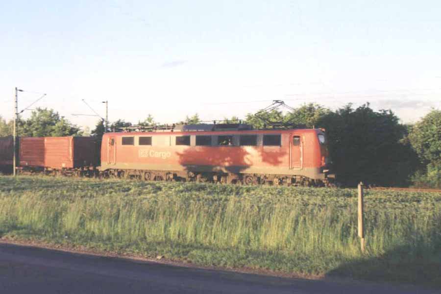 Fast freight train, pulled by a C-C-type electric locomotive.