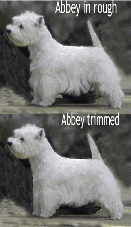 This is Abbey as she looked two weeks before the show. Jane trimmed her by computer first, as you can see. Then trimmed her "for real". |
