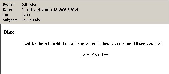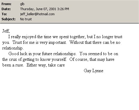 Web of Lies and Deceit, that is. This is Our Story. We met May of 2001. Jeff was living with another woman named Peggy in Apple Valley. As you can see by the e-mail below, Jeff was seeing more than just me. As he told this story, he and Gay Lynne set a date. Peggy found the email with the details and showed up at his date and made a big scene. So you can see why Gay Lynne can no longer trust him.