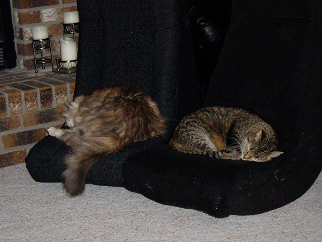 This is an image of my cats. The mood that is conveyed is relaxation/sleep. This wouldn't reinforced through lighting if the subjects were human, but because of them being cats, the lighting helps by forcing their heads deeper into their bodies to keep the lighting out. There are several sources here, so I will map all of them.