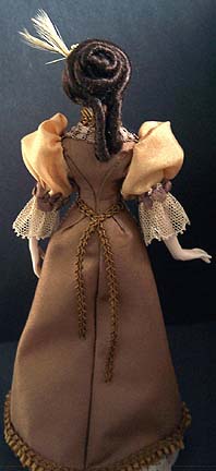 Margaret wears a Paris tea gown based on a fashion plate from Harper's Bazar dated October 1898. Her gown is light gold china silk, topped with a robe in toffee silk, trimmed with beaded lace and ruffles. She wears a feathered pearl and diamond brooch in her hair.
