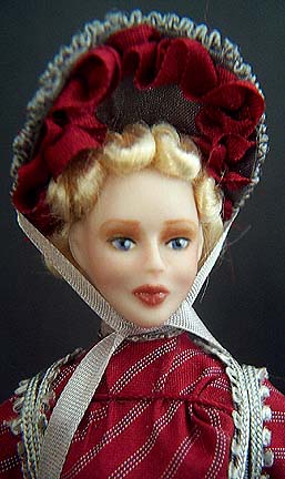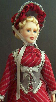 Mary wears a tissue silk dress in red/grey stripe, topped with corset style vest in grey silk. Her narrow tucked in waist and large bustle makes for a striking profile. Her matching silk bonnet is topped with a large rose, and trimmed with ribbon ruffles. She wears her light blond hair in tight waves which frame her face.