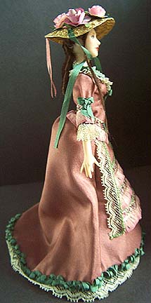 Sarah is all decked out in ribbons, bows and ruffles. She wears a garden dress loosely based on a Godeys fashion plate dated June 1877. Her pure silk two piece dress is in mauve, accented with green ribbons and off white lace. Her straw hat is overflowing with large roses and is tied securely under her chin. Her brown viscose hair is styled into soft ringlet down her back and delicate wisps around her face.