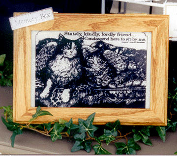 1339 Kindly Friends Memory Box. Offered in a Stunning Solid Oak box and Red Wood with Brass Hinges that can store your precious memories for many years. 3 inches deep the box measures 8 by 11 inches. The Stained Glass lid can hold one of your favorite Angel Afoot Designs. Capture a memory that you will treasure for a life time. Available also in designs, 1338 All God's Angels, 1333 Kitty Babies Night Sky, 1330 Django as well as the one featured 1339 Kindly Friends