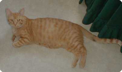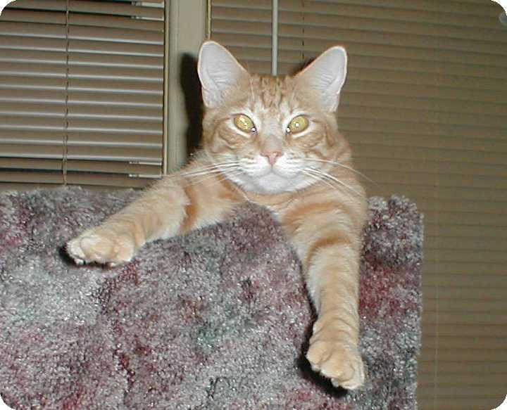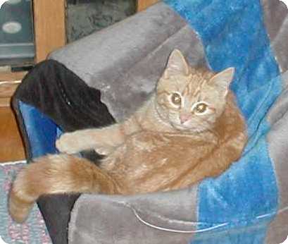 I also incorporate my work with my hockey passion. We had a BIG yellow tabby, male at the shelter. He was a little older so one of the local vets neutered and declawed him to give him a chance to be adopted. He was adopted, but the people were allergic to him so that brought him back. Finally one of our staff took him home with her because he was such a nice kitty He was very inposing in appearance since his head is as big as a mack truck and he weighs about sixteen poinds. His name "PRONGER".