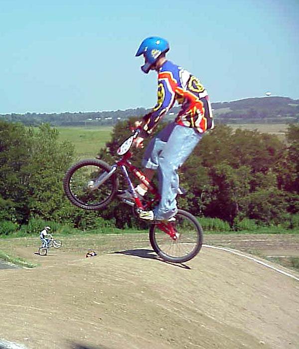 Dave Sahrmann of "Team Dave Racing" has been a tremendous benefit to the young, inexperience riders at the Parkland BMX Track. Here Jeremy Streng shows off some of his talent during a practice run Aug. 21 at NBL state championships. (Photo by Jeff Mills)