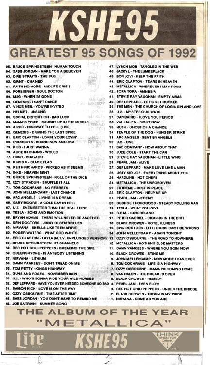 KSHE did not publish a list of top rock songs for 1999 or the decade of the 2000's. So I have taken it upon myself to list the top songs starting in 2010. Until 2016, the top list on each page is taken from ROCK charts on tunecaster, Since these are more radio played and those aren't the best songs of the year, I also list my personal favorite top songs of the year as the second list. Each song is linked to A Youtube video so you can listen to it, too!