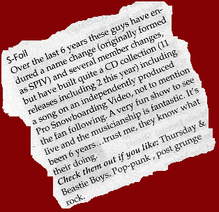 A musical triumph! One of the best bands we've seen in years! If you see one band live this year, IT MUST BE S-FOIL!!!!! - The New York Times