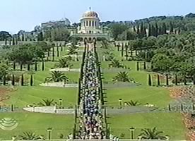 Bahá'ís ascending to the Shrine of The Báb on Mount Carmel (Haifa, Israel)In the Muslim year 1308 A.H. 1890-91 A.D. Bahá'u'lláh pitched His tent on Mount Carmel three separate times, and, near the Cave of Elijah, recited the "Tablet of Carmel"; which was His announcement to the World that He was the Promised One. He said: