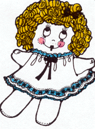 For boy doll, make same as girl. Sew 13" fabric strip to form a crotch like rompers. Cut yarn strips shorter for hair. Add a black bow tie at the neck.