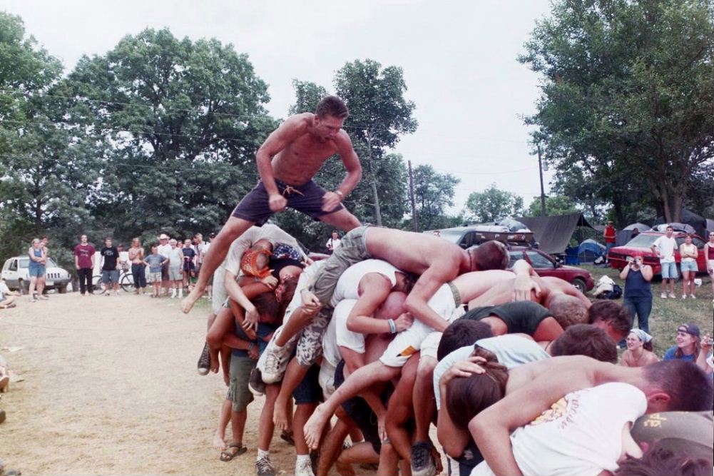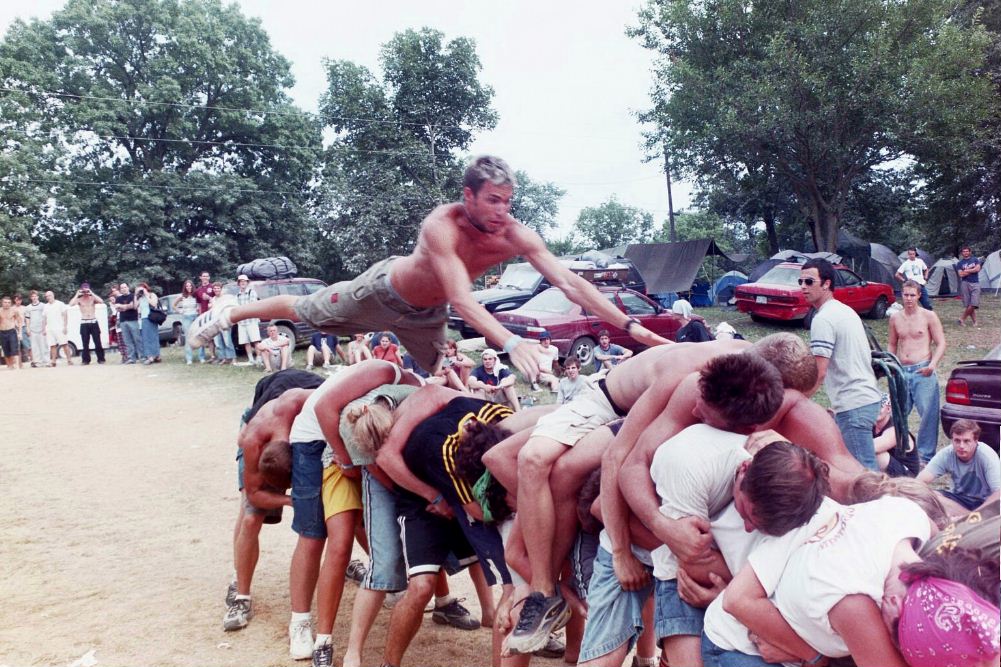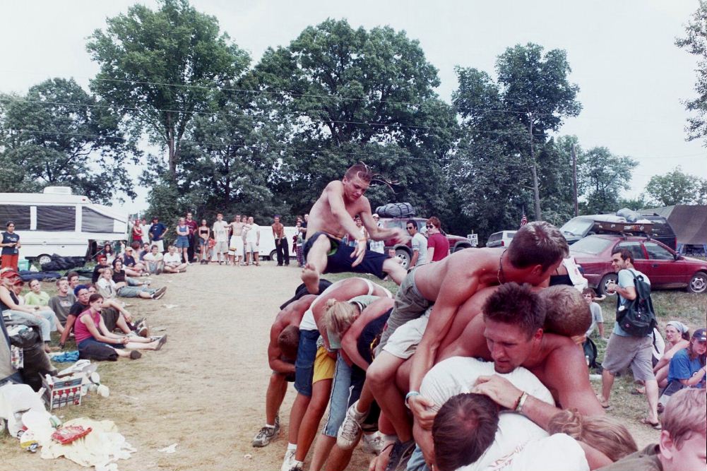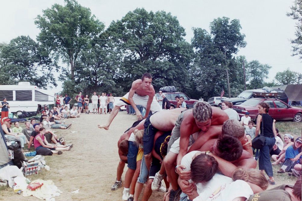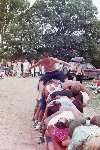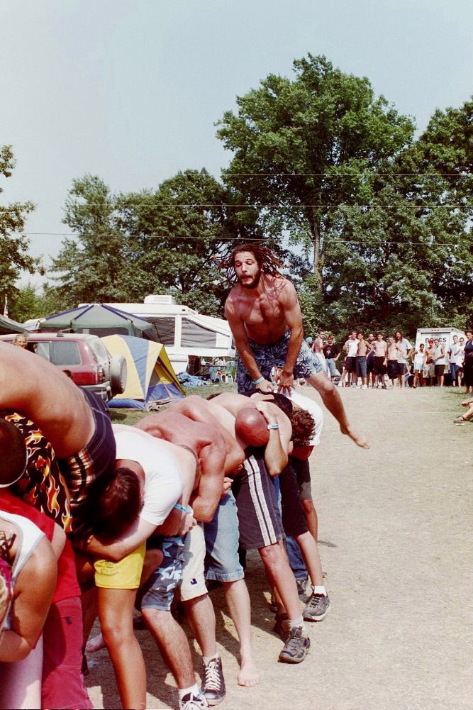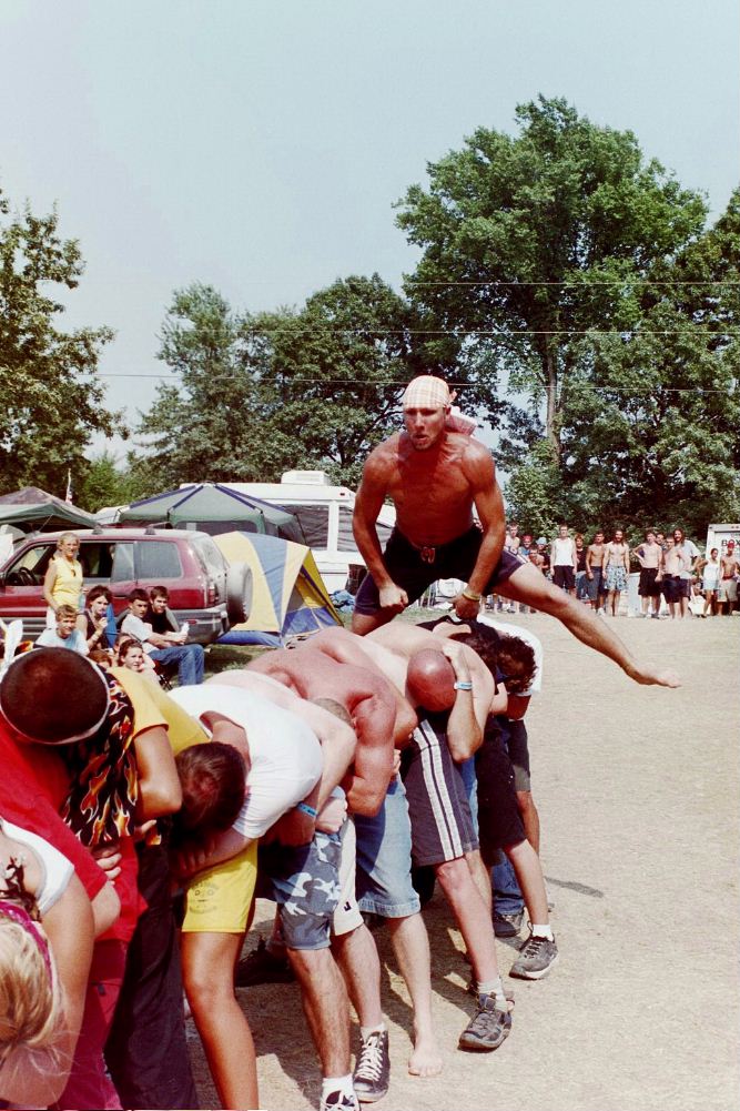Tarzan jumping onto the horse. Notice the ugly material around his head? We bought that at Wal Mart for $1 to help mark off our camp site.