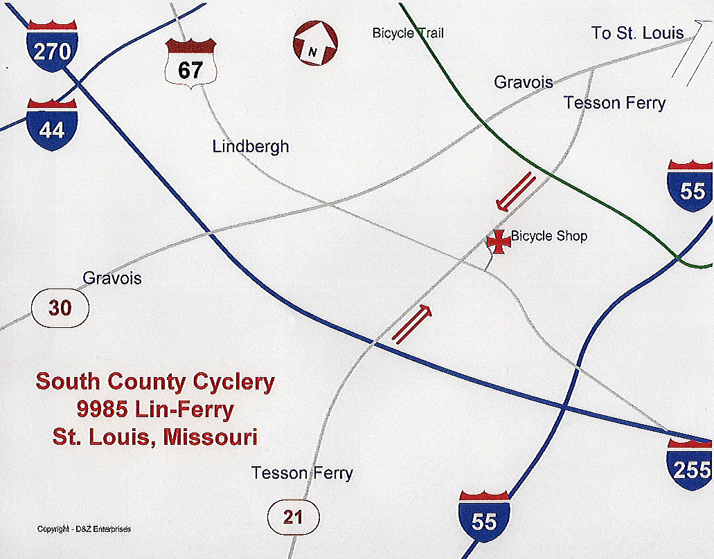 From the intersection of Interstate 270 and Tesson Ferry Road, travel north on Tesson Ferry for 4 miles. One thousand feet after the Lindbergh intersection turn right onto Lin-Ferry Road. Turn left into the shop. You may park on either side of the shop.