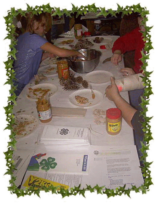On October 21, 2000, members of the Clover Connections 4-H Club provided an activity table for Lewis Elementary School's Drug-Free Health Fair. The club demonstrated how to make pinecone birdfeeders by tieing a string around a pinecone, filling the pinecone with peanut butter, and then rolling the peanut butter-coated pinecone in birdseed.