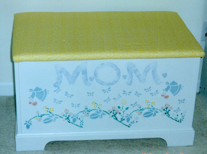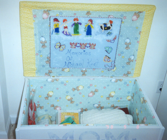For Michael's first birthday my nephew-in-law made a wooden chest in which to store all of our belongings that related to Michael. He brought the unfinished chest the week of Michael's birthday and Heaven Day anniversary so that I would have a project to focus on. It was a wonderful gift. I spent the week of that first anniversary painting, decorating and finishing Michael's chest, and then spent hours lovingly organizing the few possessions that are "his" to be stored in what is our most treasured chest. Now that chest sits in my home office, and is a cherished reminder of the love we feel for our son. When I feel like "remembering" it's wonderful to have such a nice place to retrieve his things from storage.