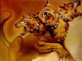 Cerberus = Three headed hound and guardian of the Underworld who stopped anyone from returning to the land of the living.