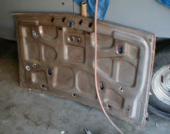 This is the trunk lid stripped. Todd has filled the framework with foam to stiffen the metal as well as quite it. The trunklid was pretty straight, so no big bodywork needed.