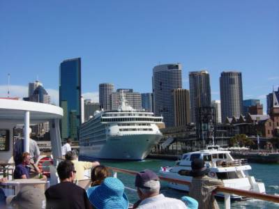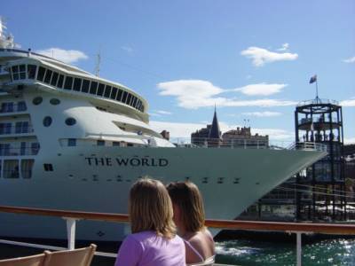 This is The World, one of the biggest and best cruise ships in the world. The commentator on the cruise told us that the worst, smallest cabin costs $1,000,000!