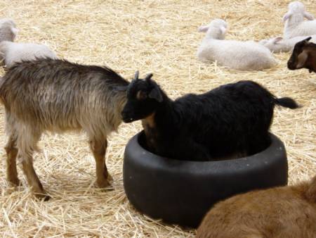 This goat couldn't be convinced to get out of the food, despite head butting from its siblings